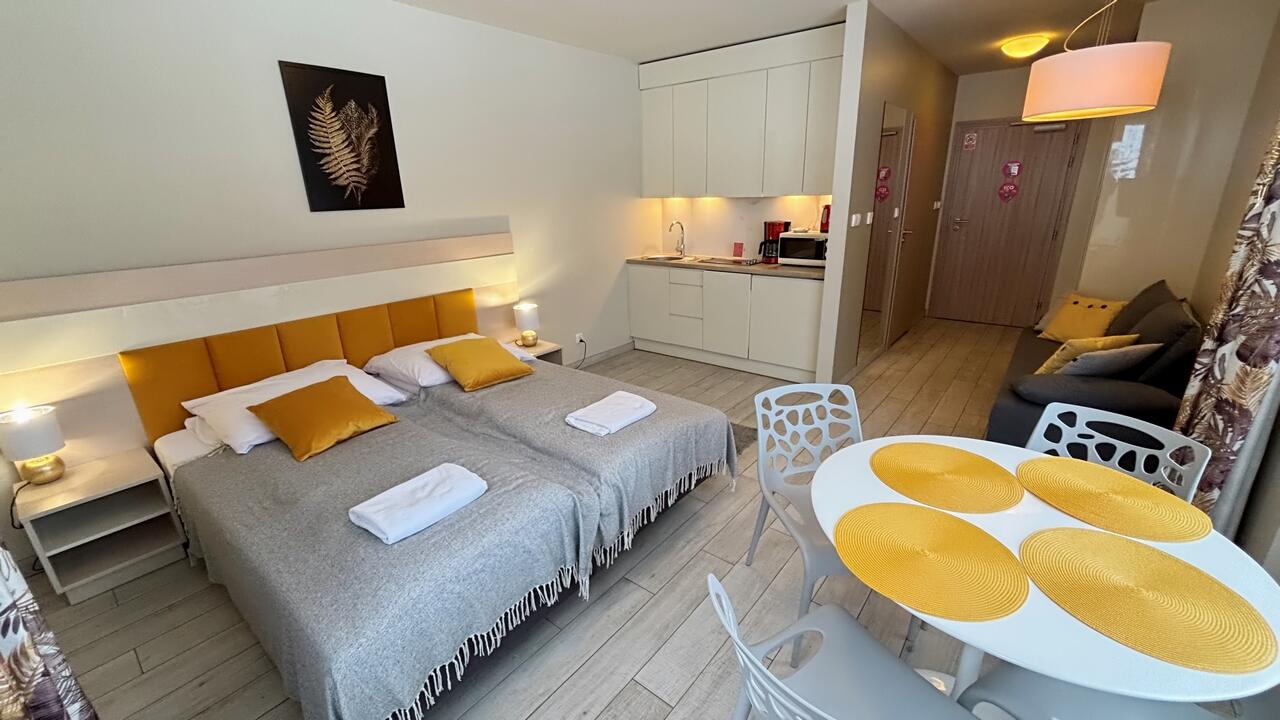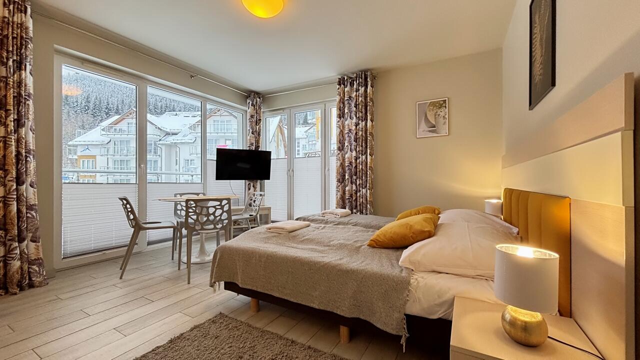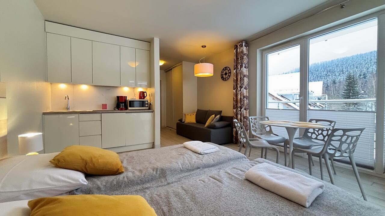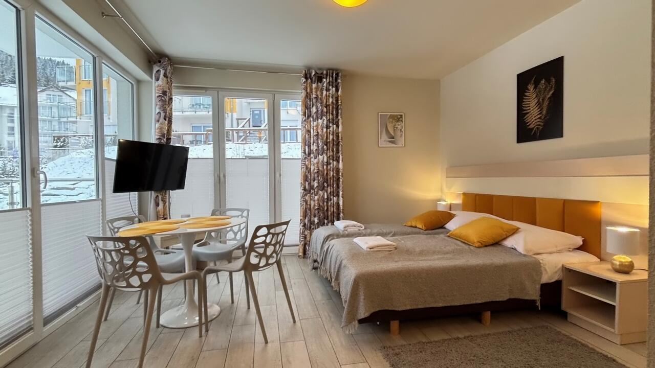 Apartmán 1kk se nachází v resortu Czarna Góra v budově Ischgl. Jedná se o malebný komplex na úpatí masivu Kralický Sněžník. V okolí se nachází mnoho krásných vyhlídek, turistických, lyžařských a cyklistických tras. Oblast je díky svým možnostem využívaná turisty celoročně.